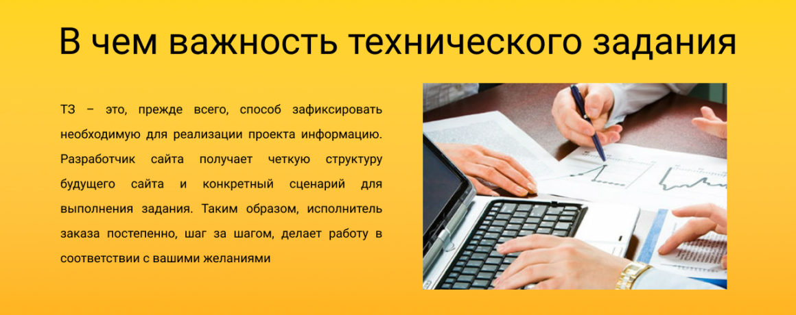 ТЗ – это, прежде всего, способ зафиксировать необходимую для реализации проекта информацию. Разработчик сайта получает четкую структуру будущего сайта и конкретный сценарий для выполнения задания. Таким образом, исполнитель заказа постепенно, шаг за шагом, делает работу в соответствии с вашими желаниями.